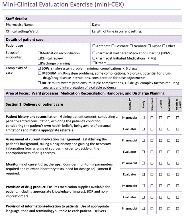 MiniCEX evaluates the pharmacists’ skillset while performing medication reconciliation, clinical review, clinical handover and discharge planning. Learning objectives of the training program were reviewed in the delivery of patient care, problem solving and professional skills. We hope the pharmacists are sufficiently skilled to ensure quality and safety of medication management in patient care, emphasizing collaborative care and patient interaction.