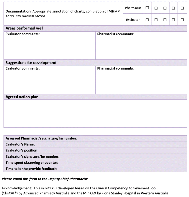 Following the self-directed learning modules, the pharmacist would shadow an experienced senior clinical pharmacist on the ward, learning by observation, demonstration and performing the duties under supervision. Finally, the pharmacist would be evaluated using a departmental assessment tool, miniCEX (Figure 3).