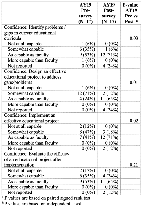 After completing the workshop and curriculum project, students reported a significant improvement in their confidence in their ability to identify problems and gaps in educational curricula (p = 0.03), ability to design an effective educational project to address gaps or problems (p = 0.01), and ability to implement an effective educational project (p = 0.02) (Table 1).