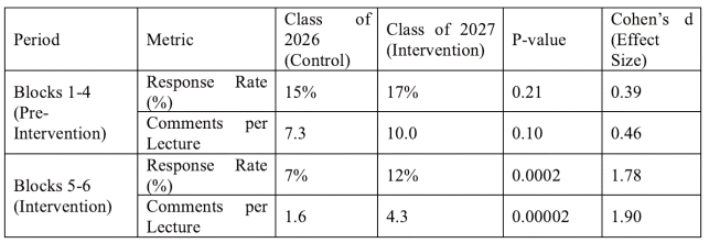 These metrics were compared between the Class of 2027 (intervention group) and the Class of 2026 (control group). Independent t-tests were performed on data from Blocks 1–4 (pre-intervention period) to assess baseline comparability between the two classes and repeated for Blocks 5–6 (intervention period) to evaluate the intervention’s impact. A p-value of < 0.01 was considered statistically significant. Cohen’s d was calculated to determine effect size for both response rates and comments per lecture.