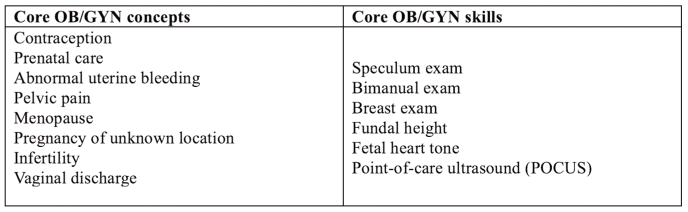 Table 1 Core OB/GYN concepts and skills. Metrics assessed in the end-of-clerkship survey administered to longitudinal clerkship students, based on APGO Medical Student Educational Objectives. Students rated their comfort with each concept or skill before and after PIONEER on a scale from 1 (Extremely uncomfortable) to 5 (Extremely comfortable).
