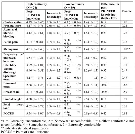 Table 2 Change in knowledge and comfort for OB/GYN concepts and skills based on studentperceived preceptor continuity. Measure is the difference between Likert scale* pre- and post-PIONEER (values expressed as means (+/− standard deviations))