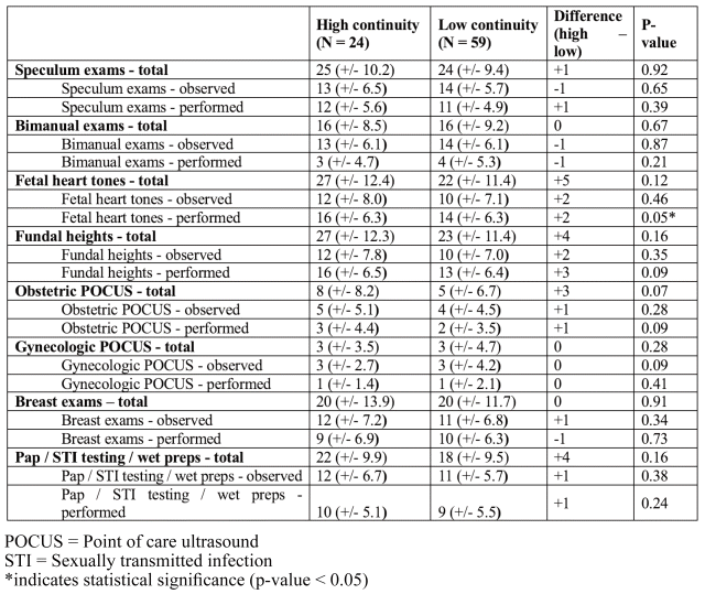 For procedural experience, students in the high continuity group tended to perform more fetal heart tone assessments compared to the low continuity group (16 vs. 13, p=0.05). No other statistically significant differences were found in the number of procedures students observed, performed, or participated in, based on perceived preceptor continuity (Table 3). While students in the high continuity group performed more procedures on average for most skills (n = 15/24, 62.5%), these differences were not statistically significant and are unlikely to be of educational importance, with the largest difference being five fetal heart tone assessments (Table 3).
