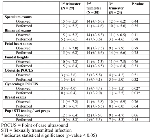 Across trimesters, students observed an average of 14 pelvic exams, 14 bimanual exams, 11 breast exams, 10 fetal heart tones, and 11 fundal heights. Additionally, they reported performing 11 pelvic exams, 4 bimanual exams, 9 breast exams, and 14 fetal heart tones/fundal heights. The only statistically significant difference across trimesters was for observed and performed gynecologic point of care ultrasound, with the third trimester reporting the least (Table 4). However, students rarely had the opportunity to observe (mean 2.79, range 0–20) or perform (mean 0.82, range 0–10) these procedures, with high variability in opportunity. Otherwise, there was no significant difference in procedural opportunities based on which trimester the student rotated in (all p>0.05).