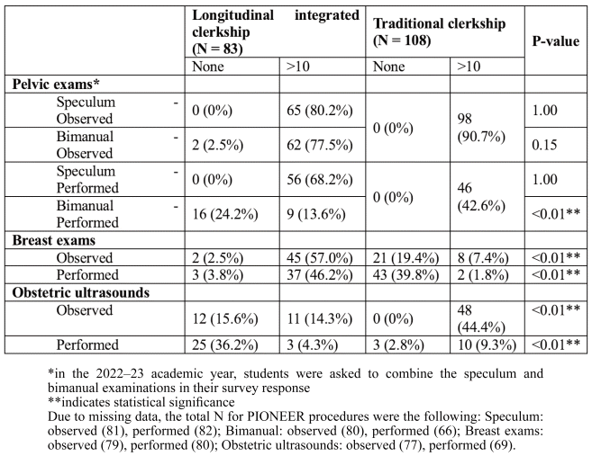 Pelvic examinations in 2022–23 were assessed using a combined estimate of speculum and bimanual exams, limiting direct statistical comparisons. In the traditional model, 42.6% (n = 46/108) of students reported performing greater than 10 pelvic examinations (either speculum or bimanual). Among PIONEER students, 68.2% (n = 56/82) performed more than 10 speculum exams. However, PIONEER students reported far less experience with bimanual exams, with just 13.6% performing more than 10 exams (n = 9/66).