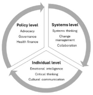 At the systems level, it is pertinent to appreciate that health systems are complex, dynamic, self-organizing entities that require constant adaptation to meet evolving needs. The interaction between multiple components defines the functionality at the systems level.5 Leaders can navigate these complex health systems and drive transformative improvements by developing competencies such as systems thinking,3 change management10 and collaboration.11 Leaders with systems-level expertise contribute to strengthening the operational capacities of health systems, thereby improving accessibility, efficiency, and outcomes.