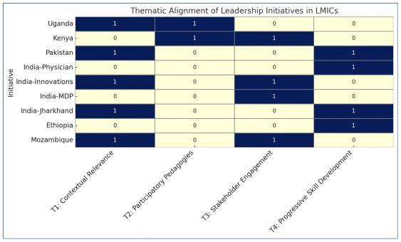 The thematic heatmap (Figure 2) was generated by mapping the nine leadership development initiatives in LMICs25–34 against the four identified themes, illustrating their relative coverage and highlighting themes that need attention to support an integrated model.