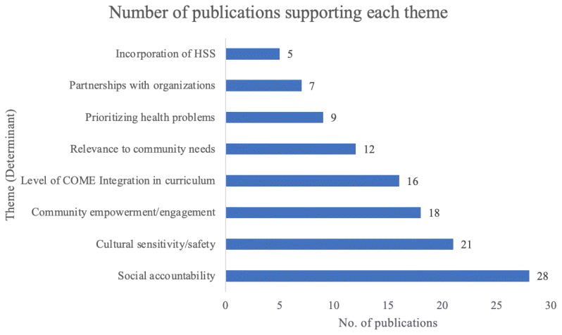 Determinants were extracted and analyzed thematically, resulting in eight central themes related to effective community-oriented medical curricula. The results were organized and presented in a framework under these eight themes which constitute the community-oriented curriculum, namely: relevance to community needs; prioritizing health problems; level of integration of community orientation in the curriculum; community empowerment and engagement; cultural sensitivity and safety; social accountability; incorporation of health systems science; and partnerships with governmental and non-governmental organizations; then, themes were unfolded to their relevant criteria. The determinants of community-oriented health professions education (COHPE) are interrelated through several bidirectional influences. Relevance to community needs informs prioritizing health problems and is shaped by partnerships with community organizations. Prioritizing health problems encourages community engagement, which in turn fosters social accountability. The integration of community orientation in the curriculum enhances cultural sensitivity, and vice versa. Incorporating health systems science aids in forming effective partnerships and is driven by social accountability. These interconnections ensure a dynamic, cohesive and responsive educational framework that addresses both community-specific health issues and help curriculum developers see how they interact and influence each other in a robust community-oriented education program (Figure 4). Figure 5 shows the number of publications that supported each theme, whereby social accountability was addressed in 28 studies, followed by 21 studies on cultural sensitivity, and 18 studies in community empowerment; and the least were 5 studies on incorporating HSS. Table 1 provides a clear and concise overview of the studies supporting each theme in the community-oriented health professions education.